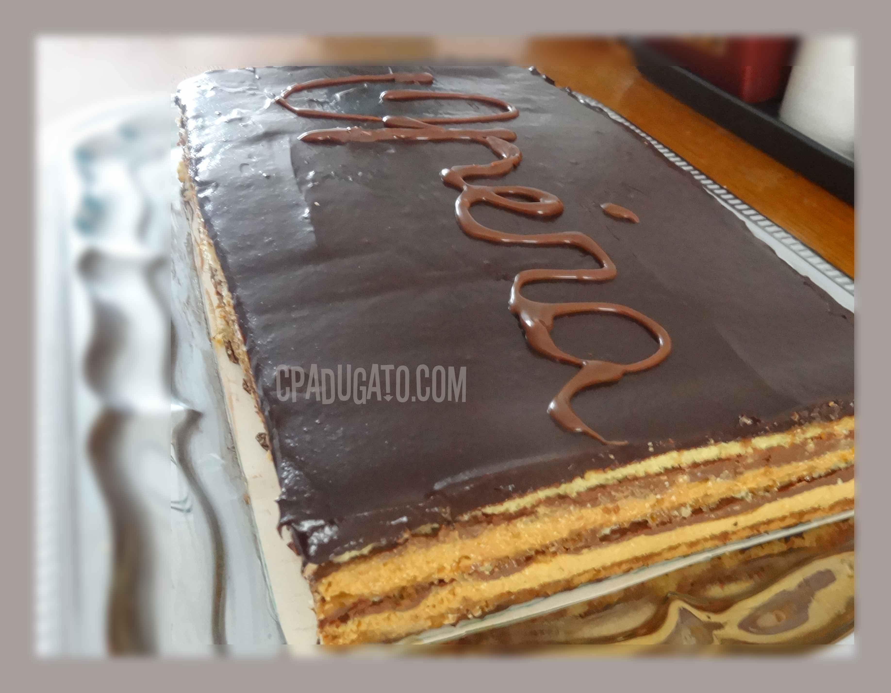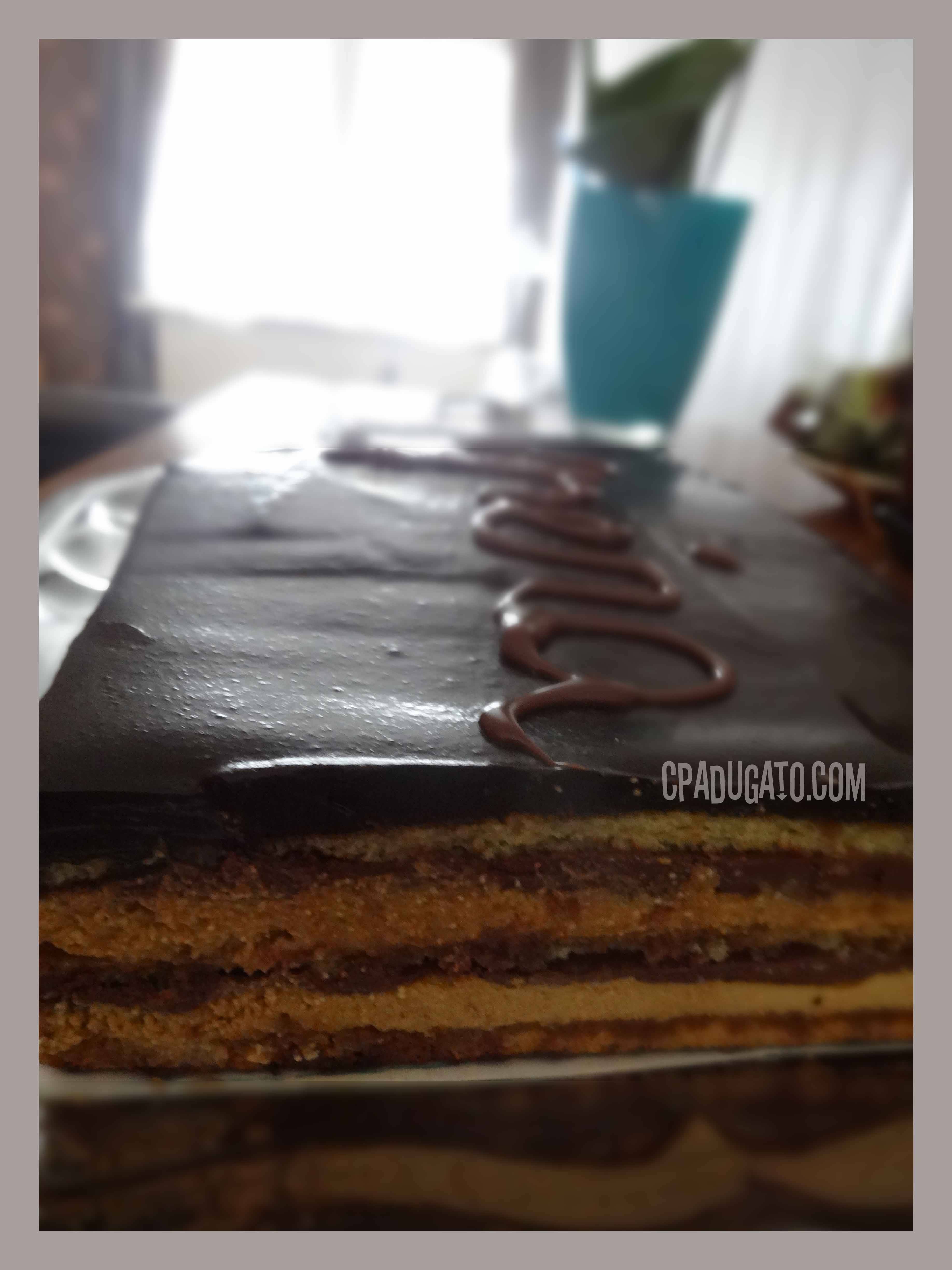 L’Opéra est une belle gourmandise en plusieurs étapes. Il y a trois couches de gâteau aux amandes (le biscuit joconde), chacun trempé dans un sirop de café , une couche de crème au beurre aromatisée au café ; une couche de ganache au chocolat , et un glaçage chocolat. Traditionnellement il est décoré avec son nom écrit par dessus et de morceaux d’or scintillant ( sans or dans la mienne, lol).