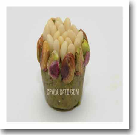 Façonner la pâte en petites boules ou en petits cônes et décorer avec les pistaches et les pignons selon votre imagination.